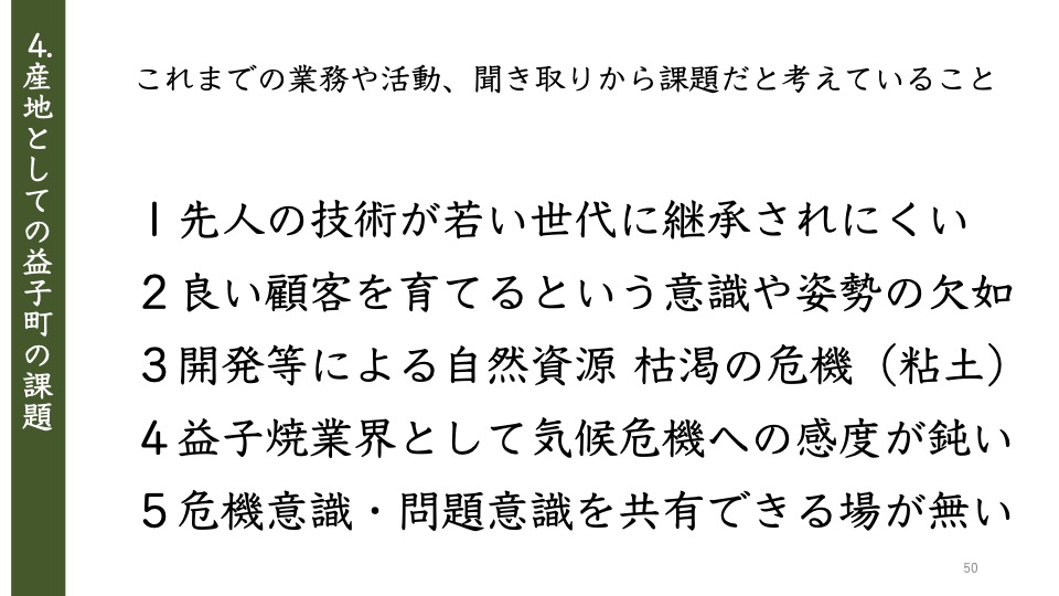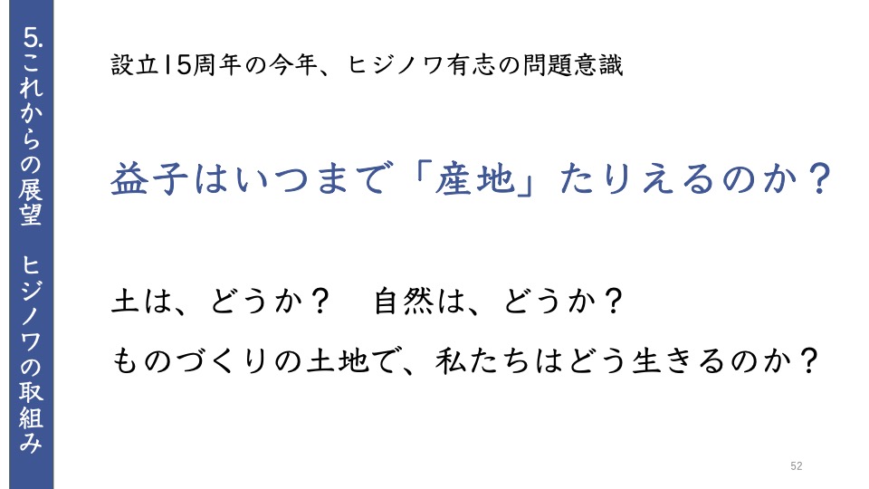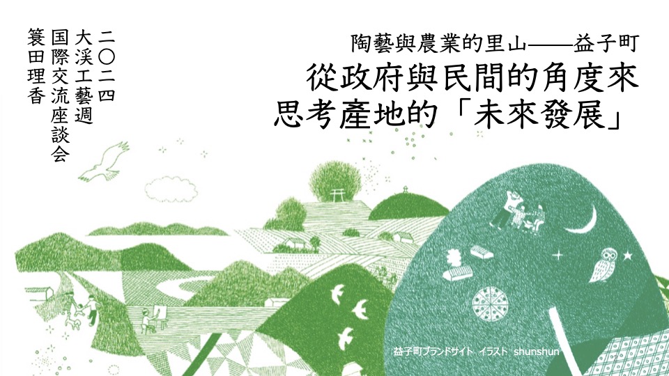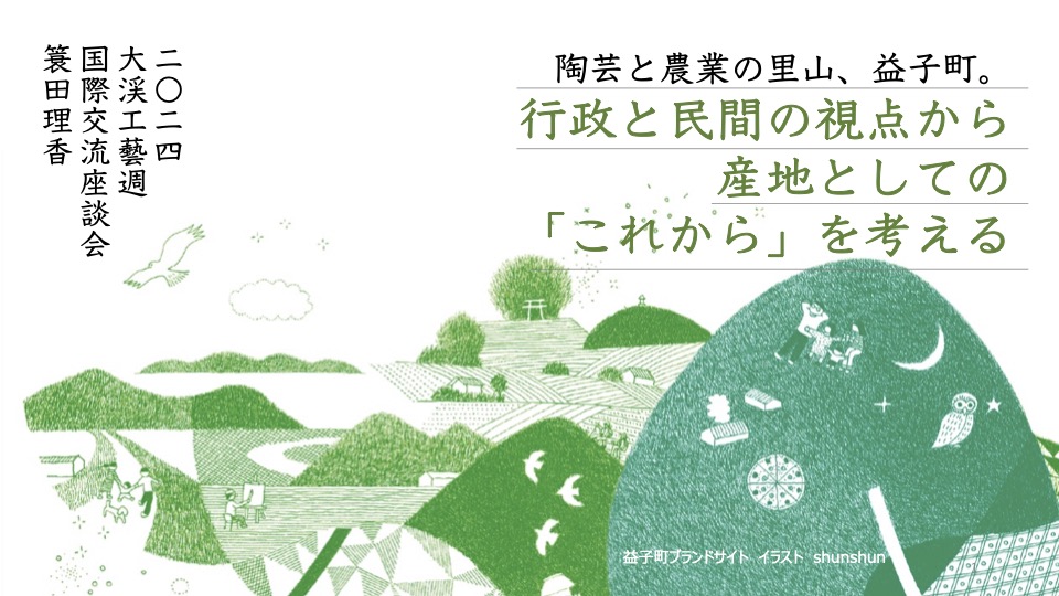 私としては、成功事例のプレゼント言うより、最後のキーワード(産地としての持続可能性)をともにシェアして考えることが大切だと、常々考えておりまして、その辺りに絞ったプレゼンにしました。プレゼンスライドから、冒頭と最後の方の何枚かを抜粋して貼っておきます。町関係の写真などは益子町観光商工課、イラストは、益子ブランドサイト制作時にお世話になった、shunshunさんの許可を得て使用しています。